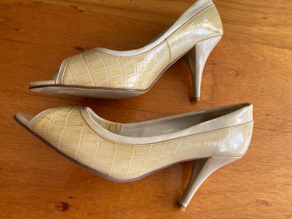 Bej renkte, parlak yılan deseni , kauçuk malzemeden yapılmış stiletto topuklu ayakkabılar. Klasik şıklık ve ofis kullanımı için uygundur.