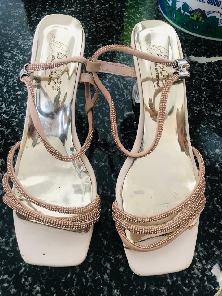 Bej parlak yve tokalı kayışı olan, kauçuk malzemeden ince topuklu ayakkabı, klasik zarafet ve sokak stilini düğünler için birleştirir.