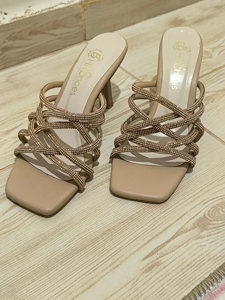 Bej renkli, yılan desenli, parlak görünümlü, tokalı bantlı sentetik kumaştan topuklu kadın ayakkabısı, düğün ve özel günlere uygun. 38 numara uyumlu