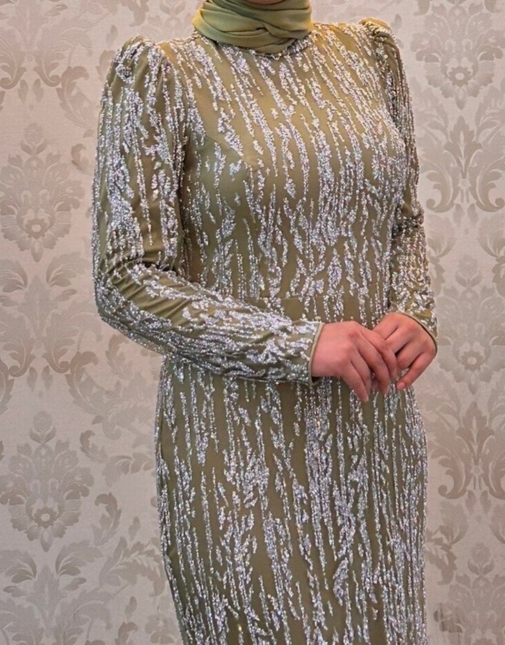 Dar kesim, uzun kollu ve yüksek yakalı bu abiye elbise, parlak bej yılan deseniyle düğünler için uygundur. (Şal ile birlikte gönderilecektir .)