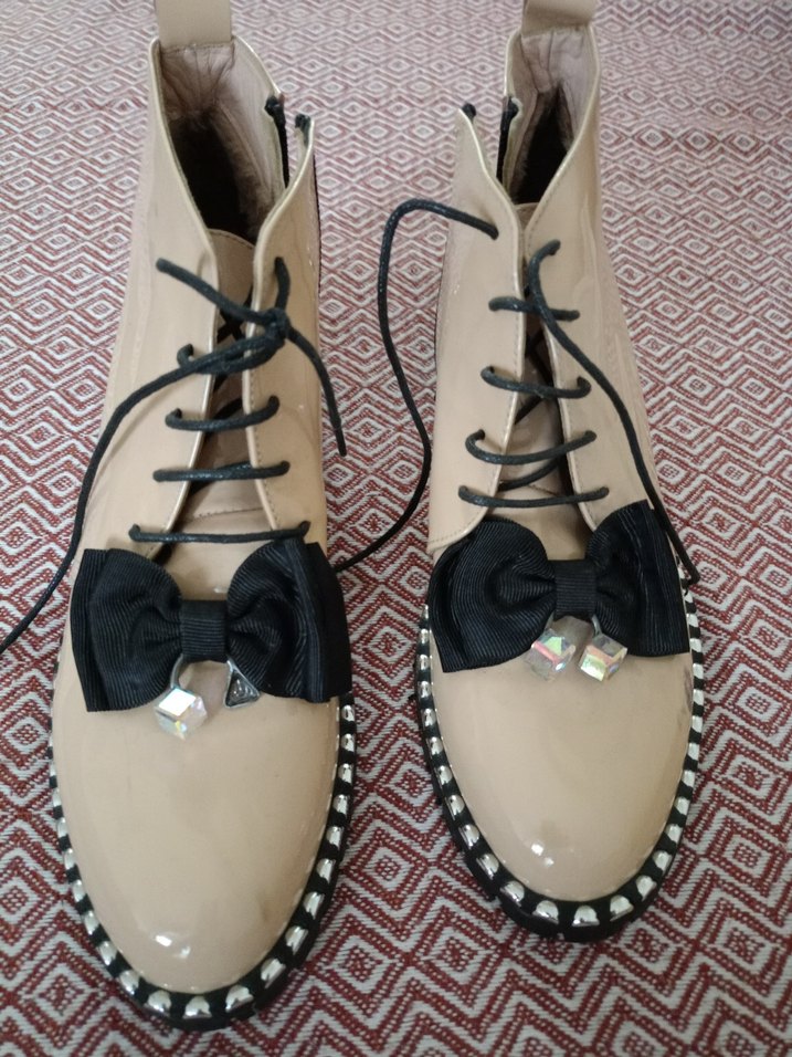 Bej Parlak Yüksek Topuklu Fiyonk Detaylı Bot
