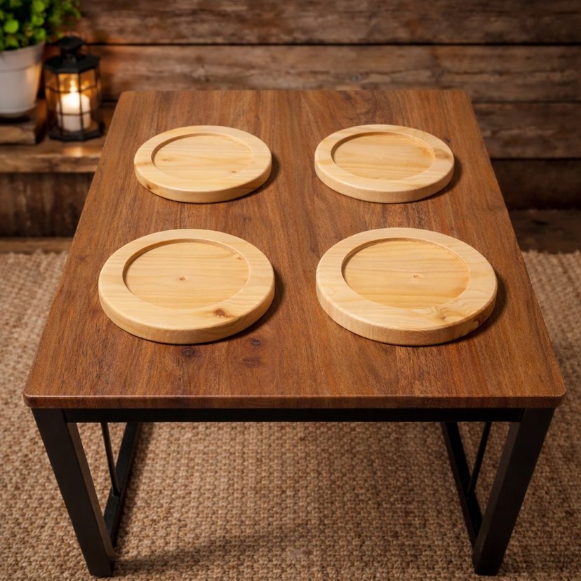 Dört adet parlak bej renkli, desen içermeyen yuvarlak ahşap bardak altlığı seti