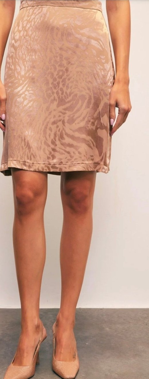 Parlak bej zebra desenli, satenimsi kumaştan, vücuda oturan kısa mini etek, romantik akşamlar için çağdaş ve zahmetsiz şıklık sunar.