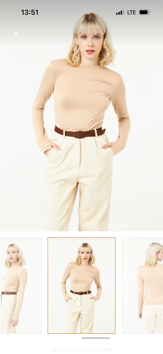 Bej renkte, yüksek yakalı ve uzun kollu kadın bluz. Pamuk kumaştan, normal kesim ve midi boyda, sade ve şık tasarım. Günlük kullanıma uygundur. Sıfır normalde 38 beden giyiyorum kalıbı dar o yüzden 40 beden aldım daha rahat oldu sadece yıkandı kullanılmadı