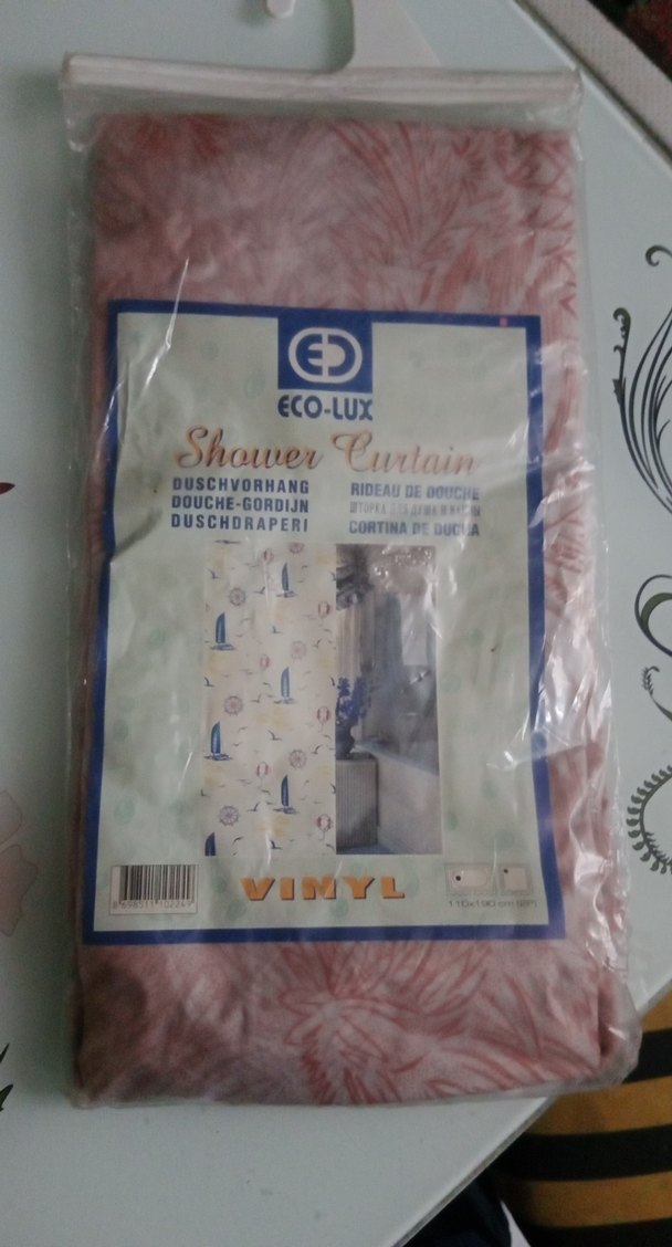 Bej renkli, pastel baskılı ve karşı kültür tarzında vinil duş perdesi, ECO-LUX markalıdır.