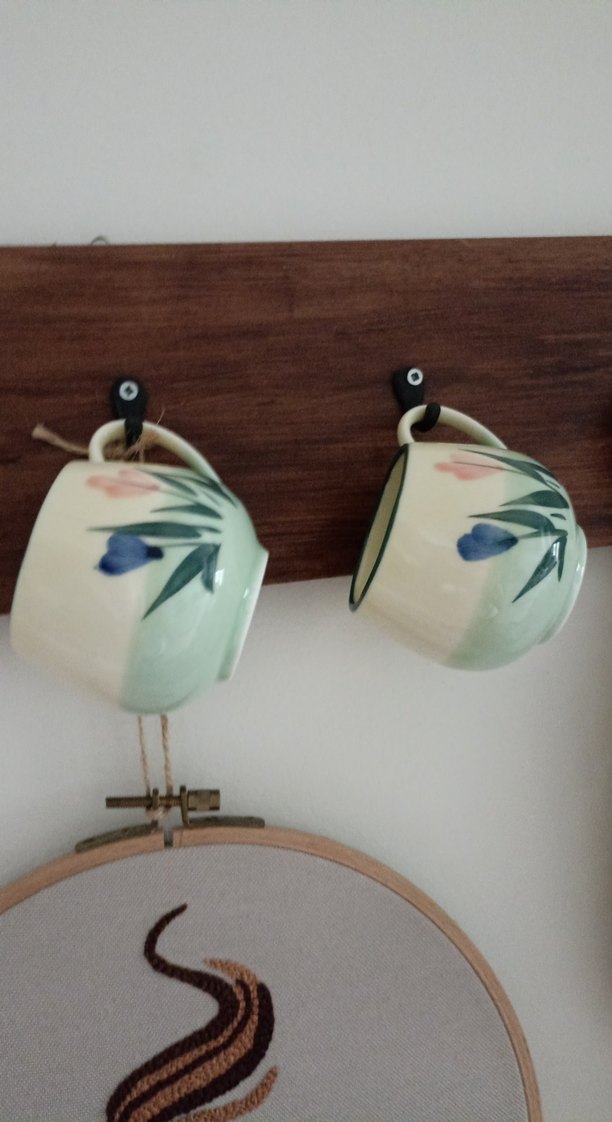 Bej renkli, pastel çiçek desenli seramik kupalar, sıcak içecekler için uygundur. ikili
