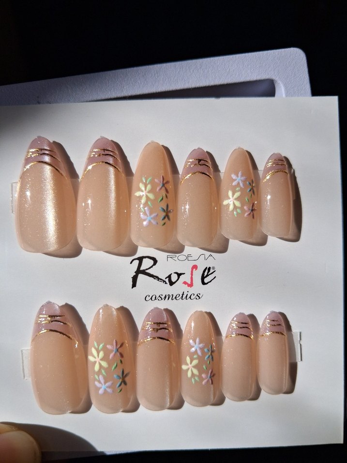 Bej pastel tonlarda, ince altın çizgiler ve zarif çiçek desenleri ile Rose Cosmetics tırnak süslemeleri.