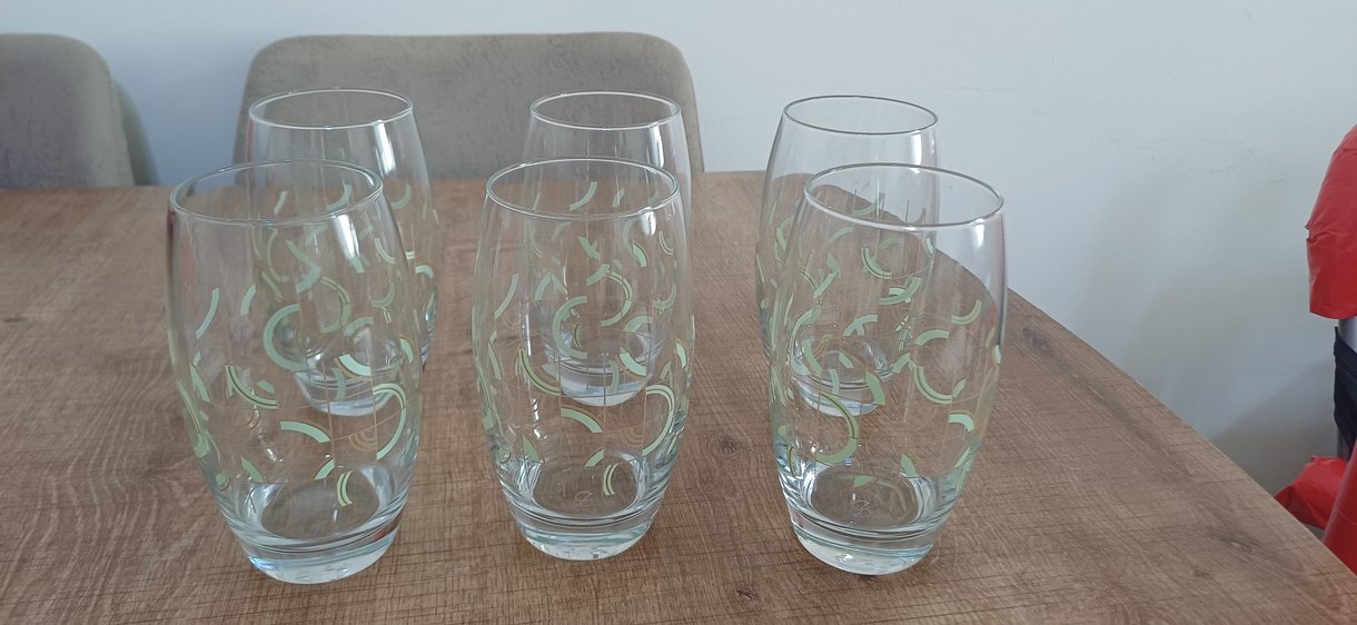 Bej pastel geometrik desenli şeffaf cam bardak, günlük kullanım için uygundur.