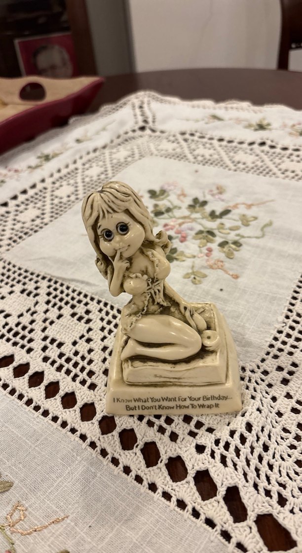 Bu bej pastel figürin, oturan ve parmağını dudağına götüren detaylı saçlı bir karakteri gösterir. Tabanında "I Know What You Want For Your Birthday... But I Don't Know How To Wrap It" yazısı bulunmaktadır.