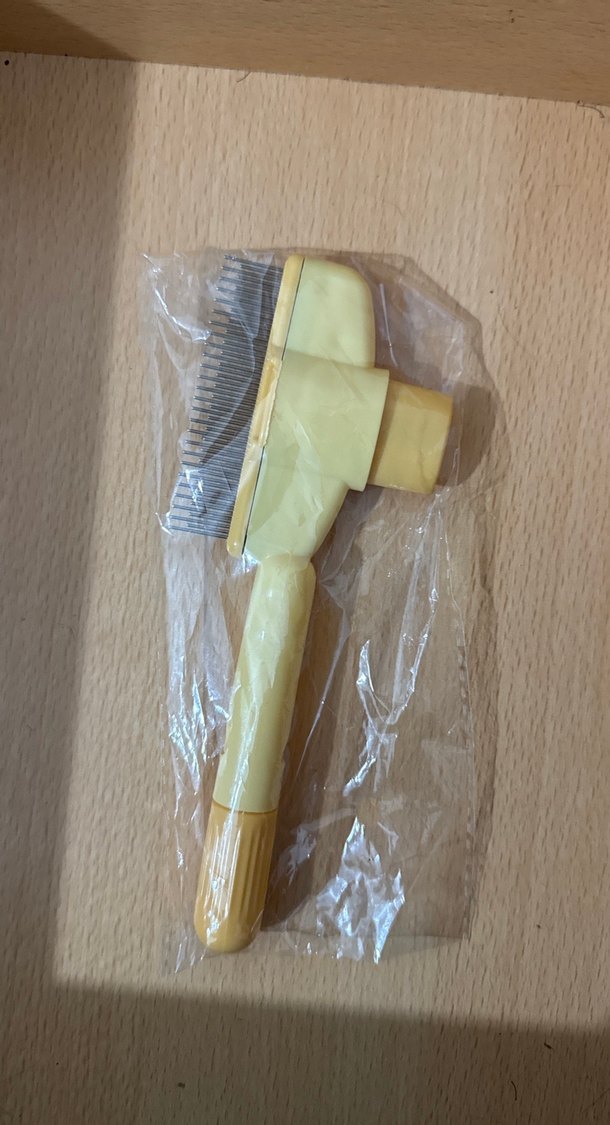 Bej pastel renkte, kedinizin tüylerini nazikçe taramak için tasarlanmış tüy tarağı.