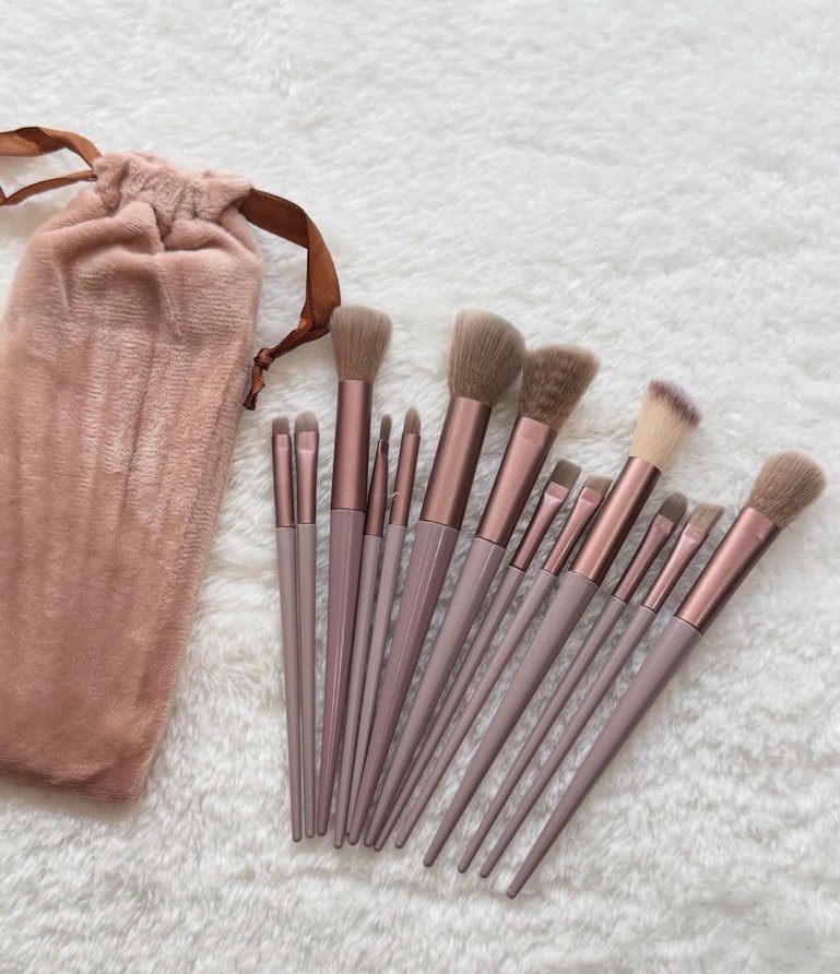 Çeşitli boyutlarda yumuşak kıllara sahip bej pastel makyaj fırça seti, kullanışlı saklama çantası ile birlikte gelir. ️