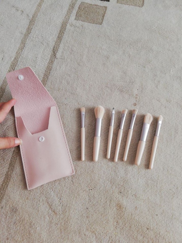 Yumuşak kıllara sahip 7 adet bej pastel makyaj fırçası ve kolay saklama için pembe taşıma çantası içerir. Komple fıyatıdır temiz ve sağlamdır yıkandı az kullanılmış bir ürün