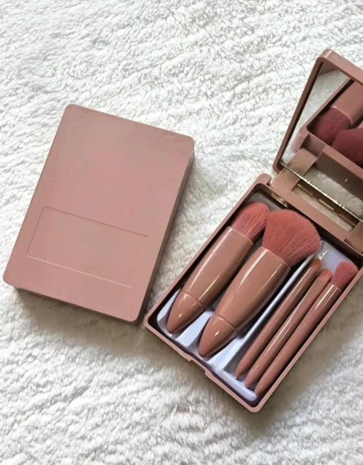 Kompakt kutuda ayna ve farklı boyutlarda yumuşak kıllı bej pastel makyaj fırçası seti.