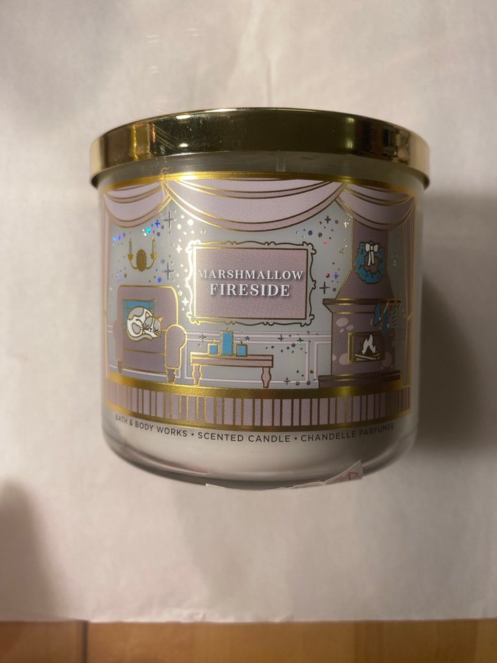 Altın kapaklı, bej pastel renkte Marshmallow Fireside kokulu mum, rahat bir oda tasarımıyla süslenmiştir. ️