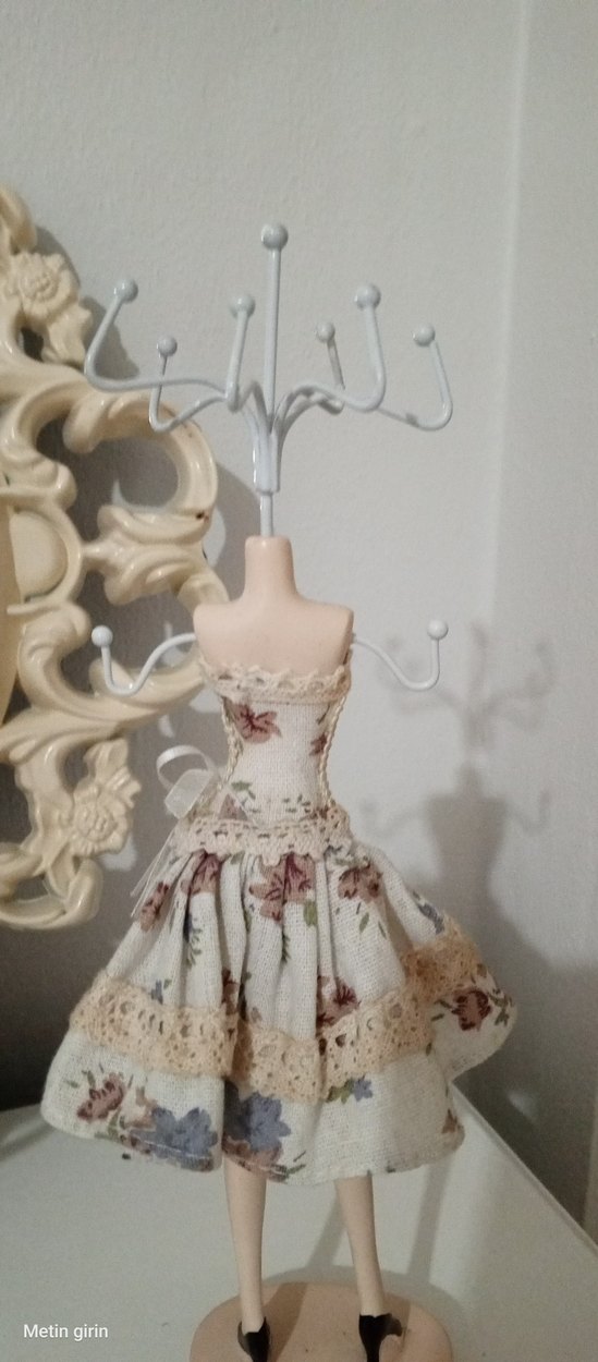 Çiçek desenli kumaş ve dantel detaylı, takı asmak için çoklu kanca bulunan bej pastel elbise formunda biblo. KULLANILDI SORUNSUZ