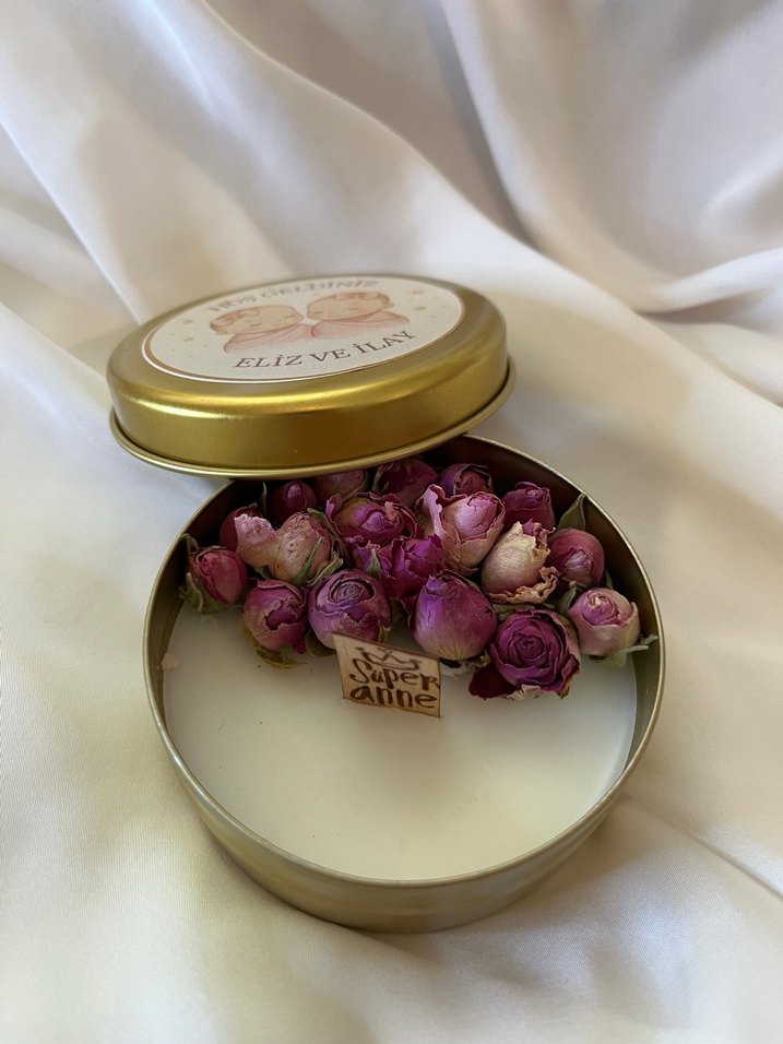 Bej pastel renkte, içinde kurutulmuş güller ve 'Anne' yazılı tahta fitil bulunan metal kutu mum.