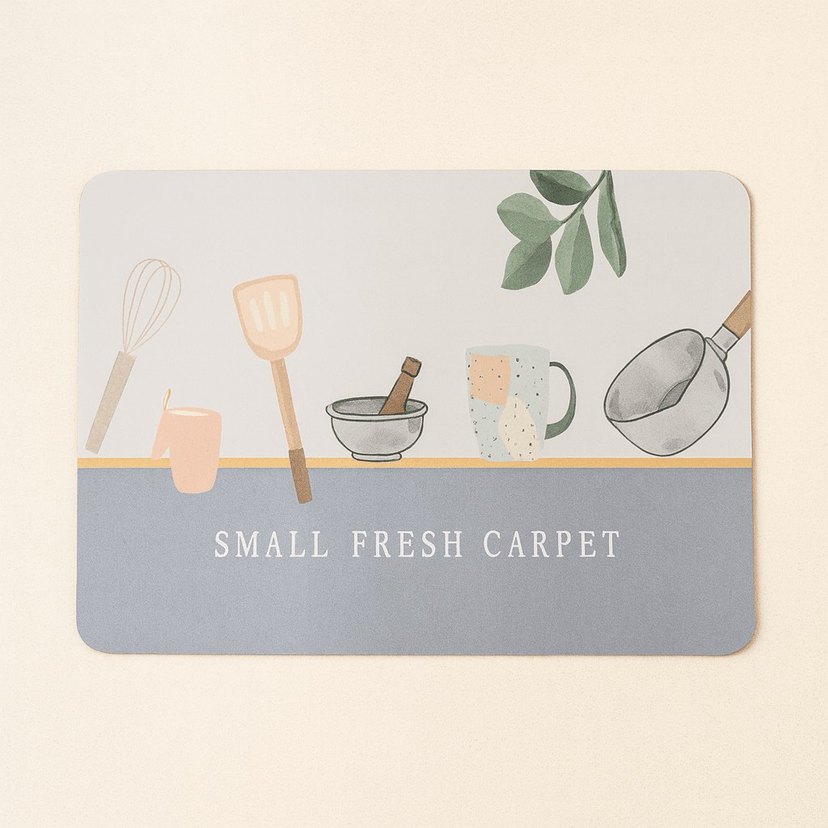 Bej renkte, pastel tonlarda ve mutfak gereçleri desenli, üzerinde 'SMALL FRESH CARPET' yazısı bulunan mutfak halısıdır. Mutfak alanınıza yumuşaklık katar.