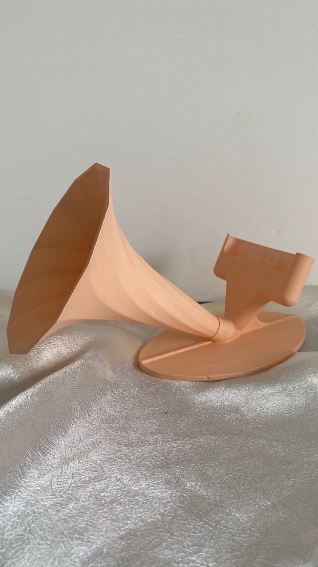 Yumuşak kıvrımlı tasarıma sahip şeftali-bej rengi arası pastel renkli müzik oyuncağı. Geniş huni şeklinde ve sağlam tabanlıdır. 3d yazıcı ile oluşturulmuştur. Arka kısmına telefon koyulunca sesi arttırma özelliğine sahiptir. Asıl rengi beyazdı ama boyamayı tercih ettim.