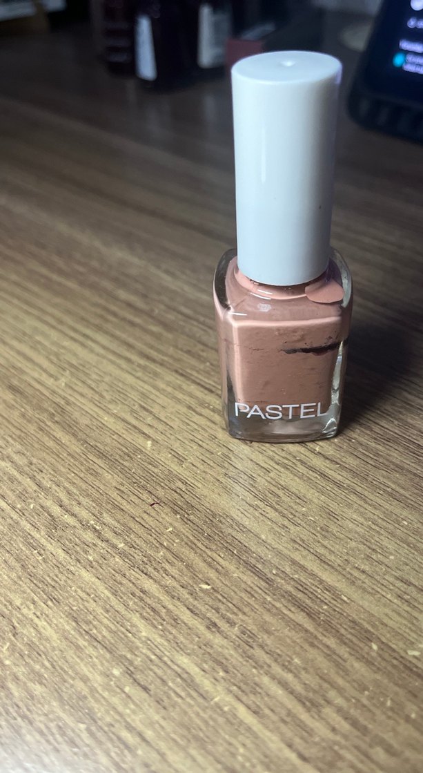 Beyaz kapaklı cam şişede bej pastel oje, üzerinde PASTEL yazısı bulunuyor. Yumuşak pastel tonda tırnaklar için.