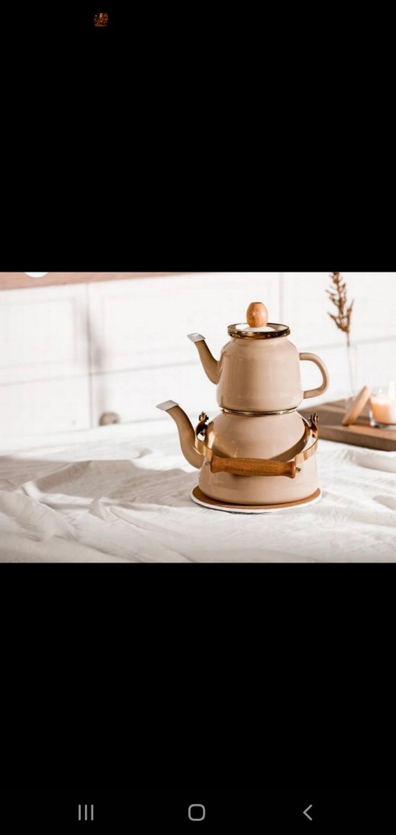 Bej pastel renkli çaydanlık seti, ahşap sap ve kapak topuzu ile yumuşak mat yüzey ve kullanışlı tasarım sunar.