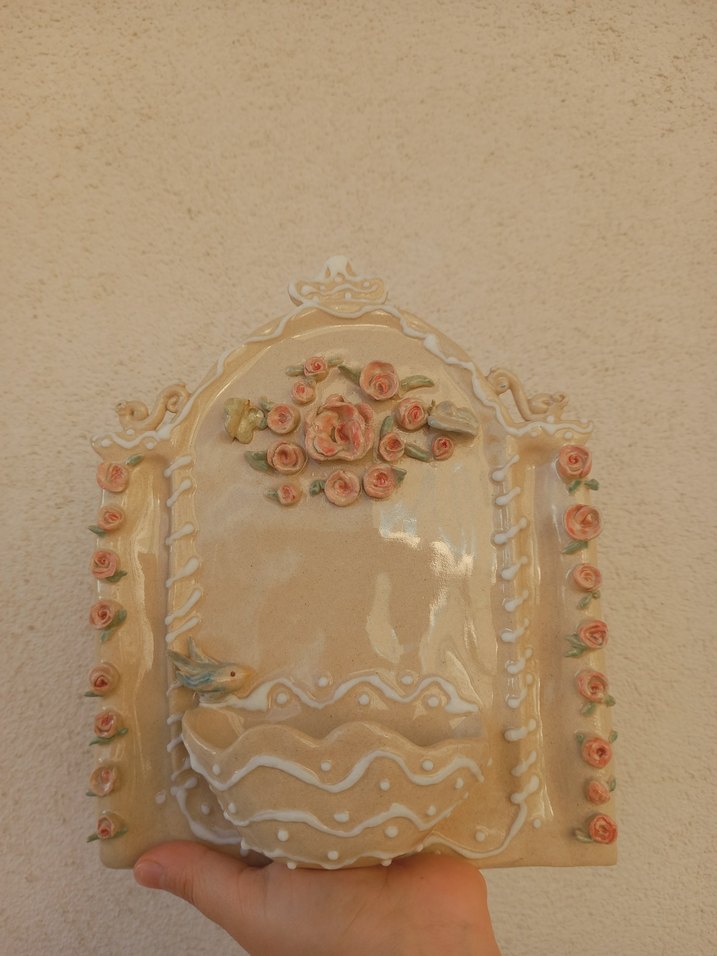 Bej pastel renkte, ince pembe çiçekler ve beyaz detaylarla süslenmiş, parlak ve el yapımı görünümlü anahtarlık ya da mumluk çift taraflı bant ile duvara yapıştırabilirsinix almadan önce mevcut olup olmadığını sorun