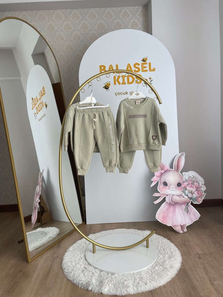 Bej pastel renkte, yumuşak kumaştan sweatshirt ve eşofman altı takımı. Baskılı detaylar ve rahat ribana manşetlere sahiptir. Üç iplik 1-2-3-4 yaş bedenleri mevcut