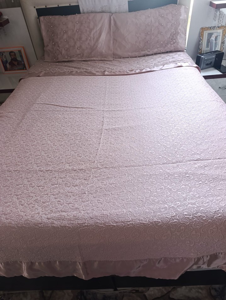 Bej pastel renkli, dokulu yüzeye sahip yumuşak ve şık yatak örtüsü.