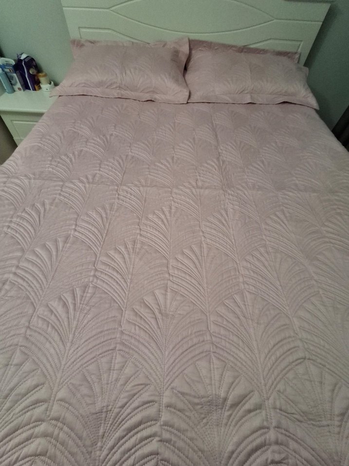 Pastel bej renkte, kabartmalı yaprak desenli yatak örtüsü, yatak odanıza yumuşak ve şık bir görünüm kazandırır.