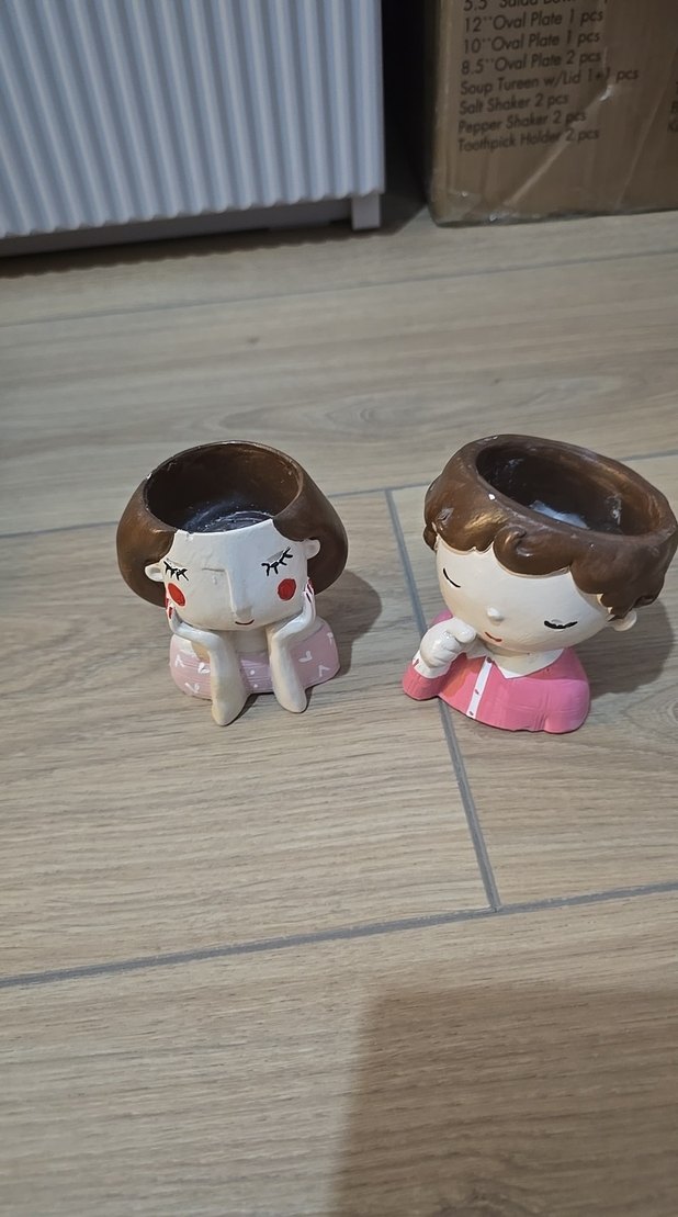 Bej pastel renklerde, kapalı gözlü ve kahverengi saçlı iki çocuk figürini seti. Nazik yüz ifadeleri ve pastel renkli kıyafetlere sahip. mumluk olarak kullanildi sorunsuz. ikisinin fiyatıdır