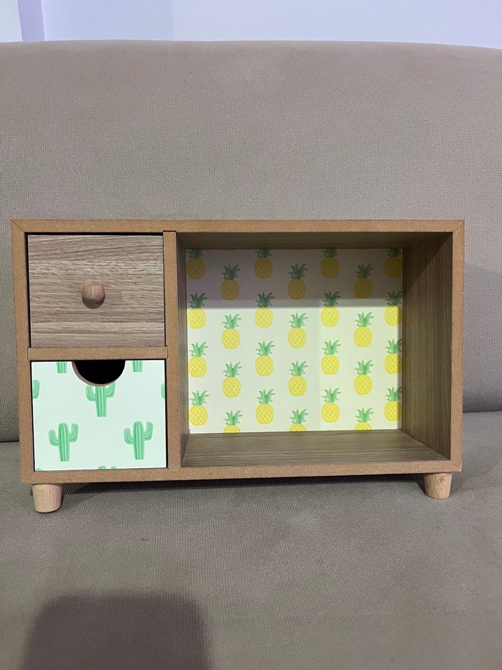 Bej renkli, pastel tonlarda, ananas ve kaktüs desenli iki çekmeceli ve açık raflı çocuk komodu. Hem yetişkin, hem cocuk için idealdir. Tek bir bacagı eksiktir, kullanıma engel değildir.