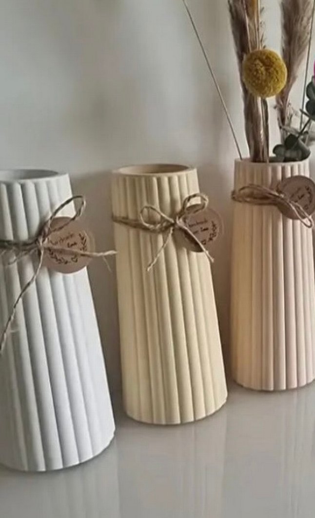 Dikey çizgili, bej pastel seramik vazo. Üzerinde dekoratif ip bağı bulunur. Kuru çiçekler için uygundur.