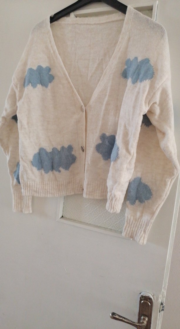 Bej renkte, uzun kollu ve yakalı triko kadın hırka. Rahat kesimi ve pastel mavi detaylarıyla günlük kullanıma uygun, konforlu bir modeldir.