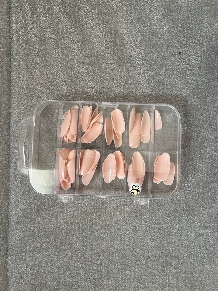 Pastel bej tonlarında, farklı boylarda yapay tırnaklar şeffaf kutuda düzenlenmiştir. Yapıştırıcı mevcuttur