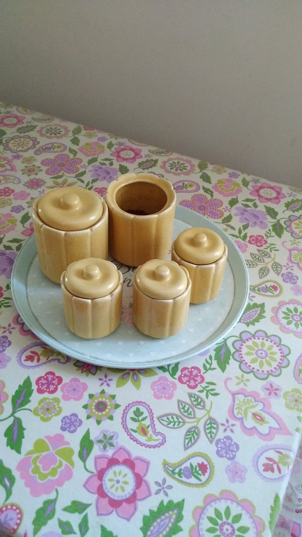 Bej pastel renkli seramikten yapılmış, kapağı olan beş adet baharatlık seti. Yumuşak ve pürüzsüz yüzeye sahip, mutfakta düzen için uygun.