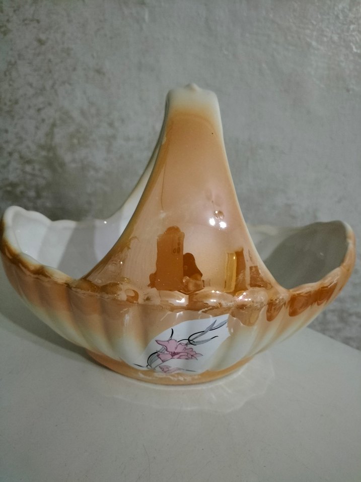 Pastel tonlarda bej seramik sepet, parlak yüzey ve çiçek detayına sahip, dekoratif kullanım için uygun. eski yıllar