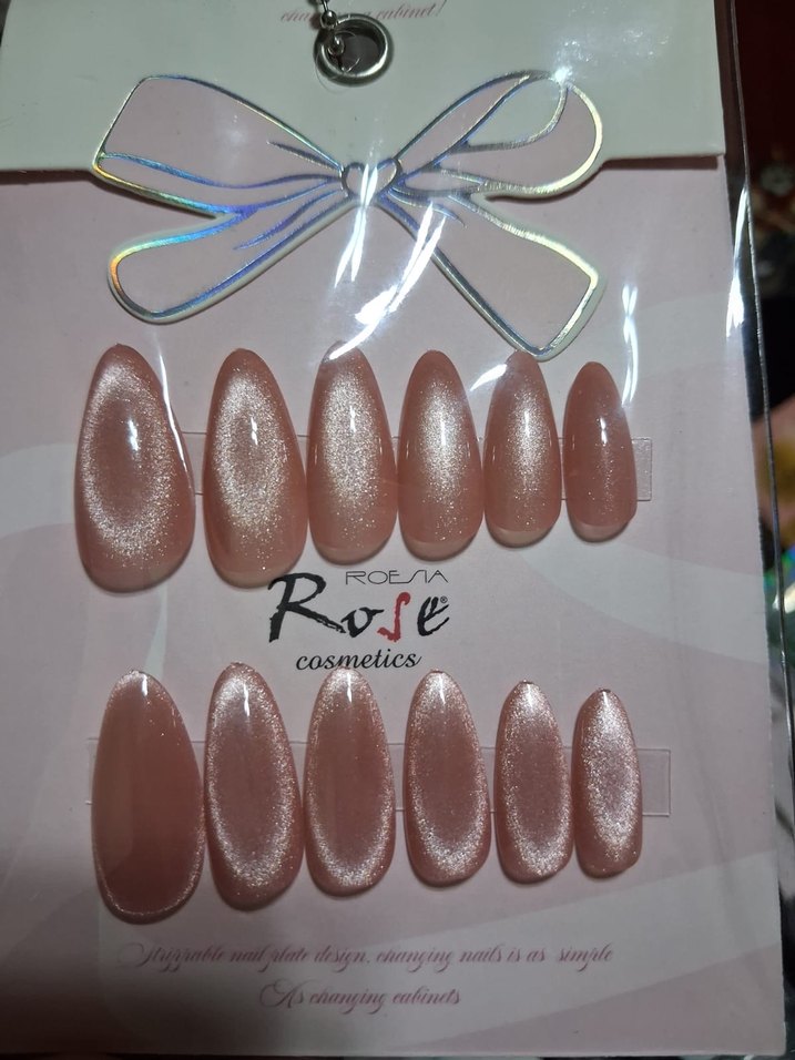 Rose cosmetics markasına ait bej pastel tonlarda, hafif parlak tırnak süslemeleri. Zarif ve yumuşak bir görünüm sağlar.