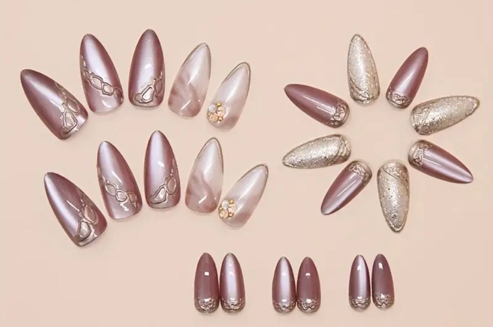 Bej pastel tırnak süslemeleri, zarif metalik ve taş detaylarıyla şık bir görünüm sunar.