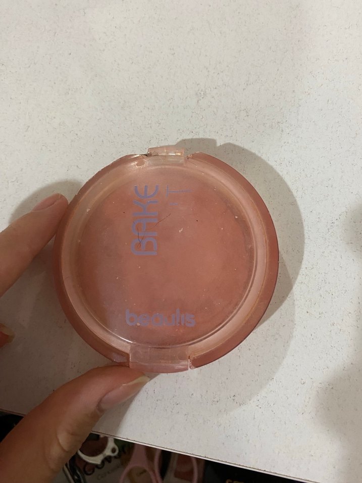 Yuvarlak kutuda, yanaklara yumuşak renk veren bej pastel tonlu allık.
