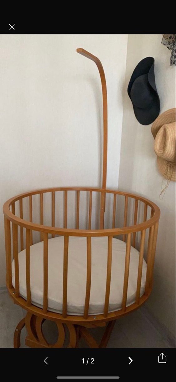 Bej pastel renkli yuvarlak bebek sepeti, ahşap çubuklu çerçeve ve iç kısmında yumuşak bir yatak içerir. Rahat ve güvenli uyku alanı sunar. ️sallanan beşik ankara