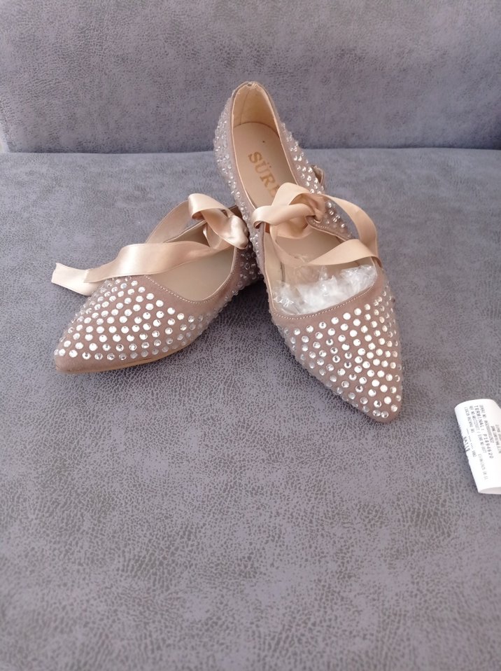 Bej renkte, payet işlemeli ve kurdele bağcıklı, modern tarzda babetler. Hafif ve şık tasarım.