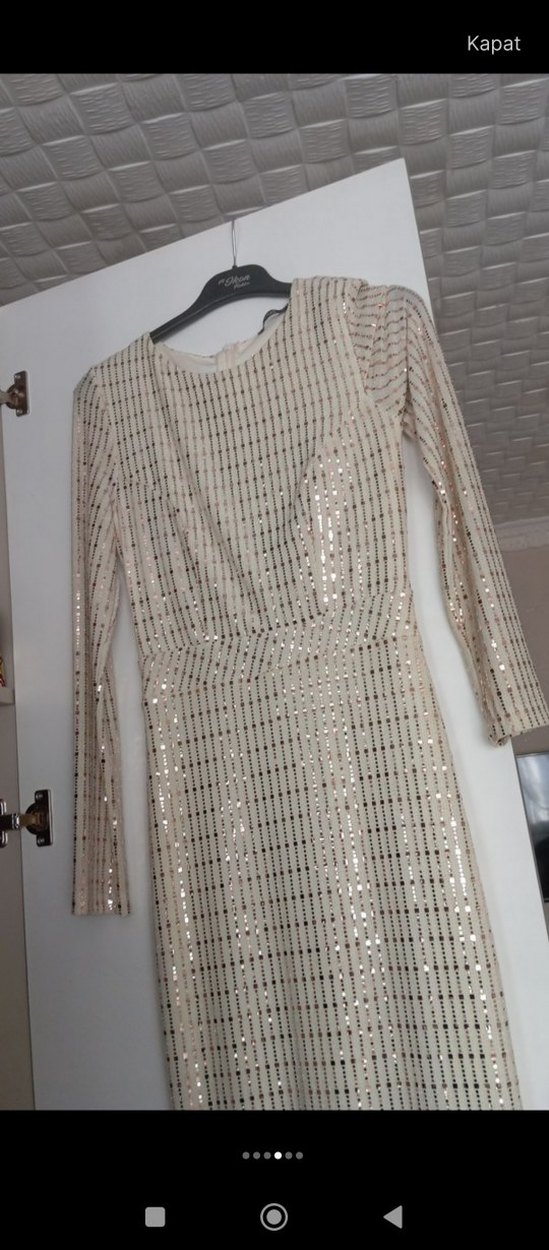 uzun kollu, bej rengi payetli parlak ve taşlı desenli, kadınlar için uzun ve dar kesim balık model abiye elbise. ✨