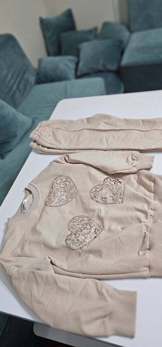 Bej renkli, bol kesim kız eşofman takımı. Uzun kollu, bisiklet yaka ve payet işlemeli nakışlı kalp desenleriyle süslenmiştir.