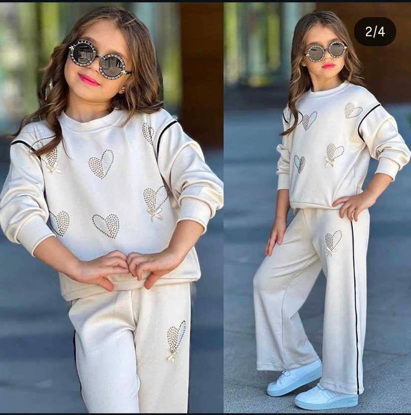 Bej renkli, bol kesim, uzun kollu, bisiklet yaka, payetli nakışlı kalp desenli kız eşofman takımı. ✨