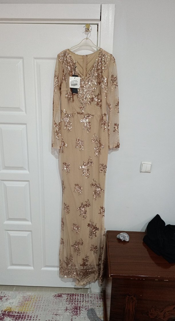 Bej renkli, payetli çiçek desenli, V yakalı ve uzun kollu, bohem ve gösterişli tarzda, düğünlere uygun dar kesim uzun abiye elbise.