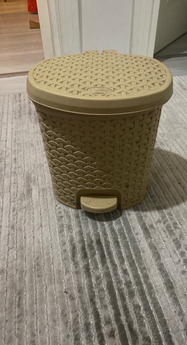 Hasır desenli, pedallı bej renkli saklama kutusu. Alan düzenlemek için kullanışlıdır. ️