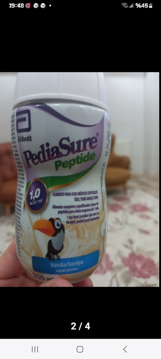 Bej renkte, vanilya aromalı PediaSure peptitli bebek şişesi. 1 yaş üzeri çocuklar için özel tıbbi kullanım amaçlı, 1.0 kcal/ml enerji içerir.