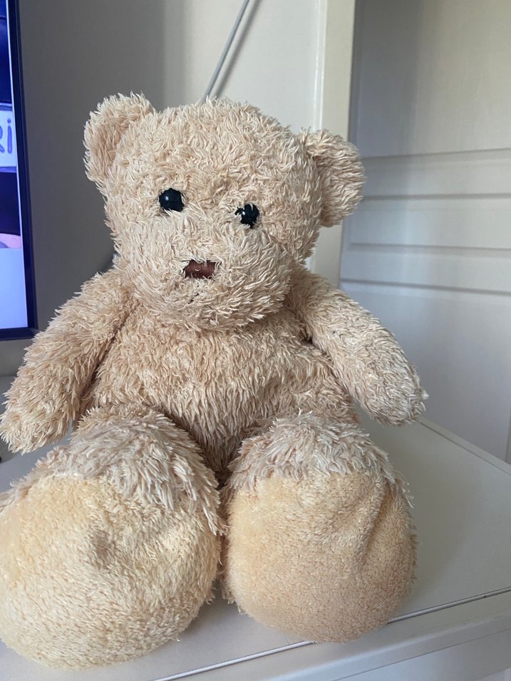 Pastel tonlarda, yumuşak bej peluş ayıcık oyuncak, detaylı dikişli ve sevimli tasarıma sahip.