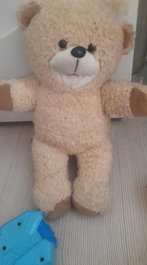 Pastel tonlarda, yumuşak bej peluş kumaştan yapılmış, dikişli yüz detaylarına sahip ayıcık oyuncak.