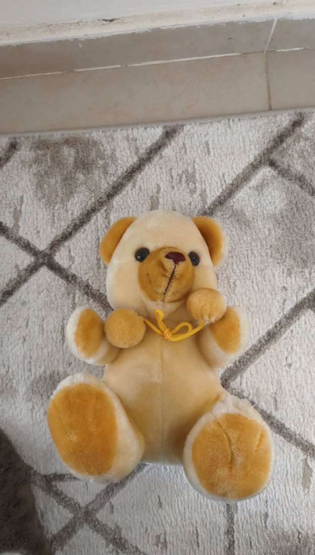 Gri tonlarında bej peluş ayıcık, yumuşak ve sarılmaya uygun.