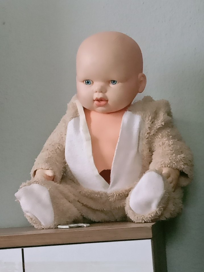 Bu bej bebek, yumuşak dokulu kıyafet ve mavi gözlü, pürüzsüz plastik yüzeye sahiptir. Rahat oturacak şekilde tasarlanmıştır.